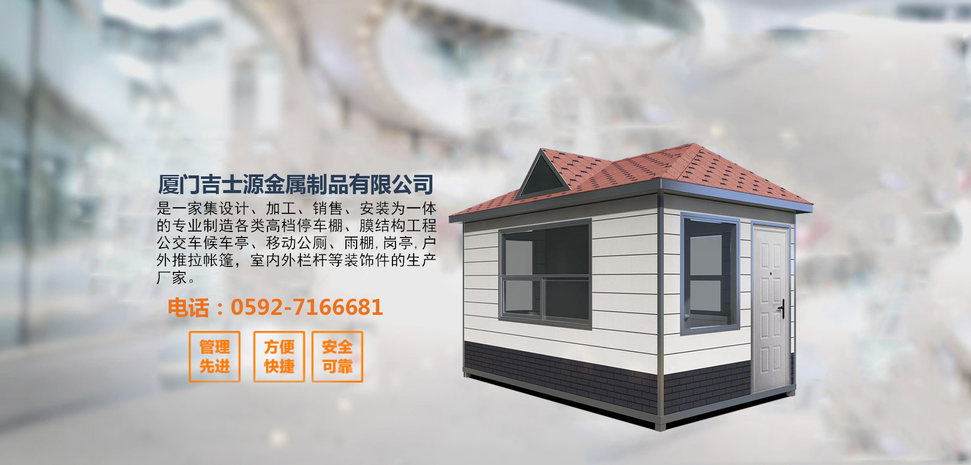 廈門吉士源金屬制品有限公司,位于中國旅游名城廈門。是一家集設計、加工、銷售、安裝為一體的專業制造各類高檔停車棚、膜結構車棚、移動公廁、雨棚、智能遙控車庫門、不銹鋼旗桿、崗亭、戶外推拉帳篷、曲臂伸縮雨棚、鐵藝樓梯扶手、防盜網、庭院豪華大門、室內外欄桿、綠…